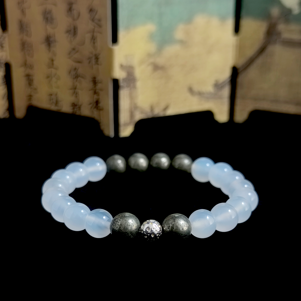 This bracelet combines Pyrite (Earth) for grounding, stability, and energetic protection, with White Agate (Metal) for clarity, healthy boundaries, and inner confidence.